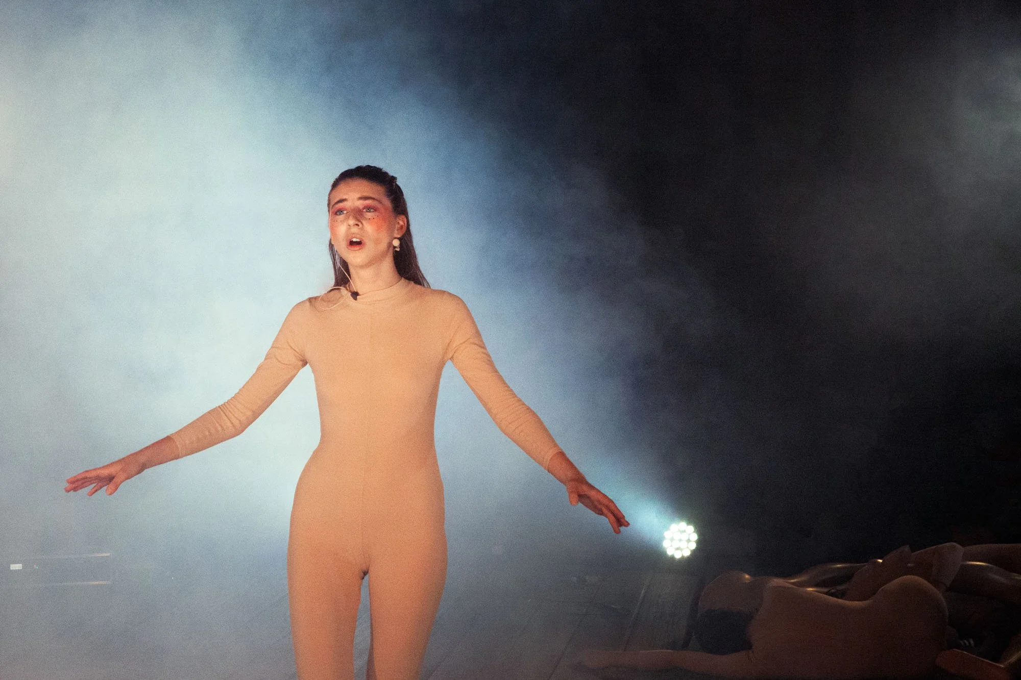 The performance BREAK THE CHARM is a collaboration between dance artists Julie Carrere, Agathe Vincent, and music producer Dahlia Rebecca. The theme of masculine dominance over women's bodies was predominant in their process. Together they developed body-based strategies and composed a series of attempts to make their emancipation visible in the form of a musical.